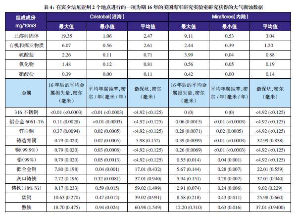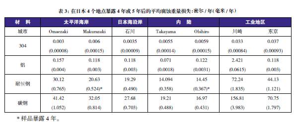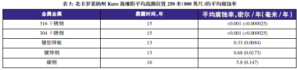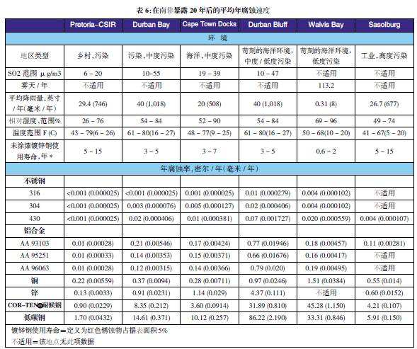 表3至表6的數據來自于日本、巴拿馬、Kure 海灘(北卡萊羅納州)和南非的試驗地點??衫眠@些數據在類似環境中選擇適當的金屬材料,進行生命周期成本分析。